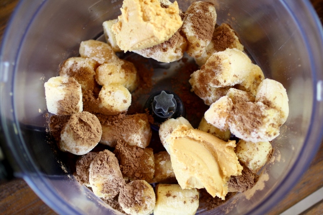 1. To a food processor add the bananas, cocoa powder and peanut butter. Process until creamy. Serve immediately with some chocolate chips.